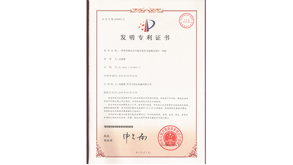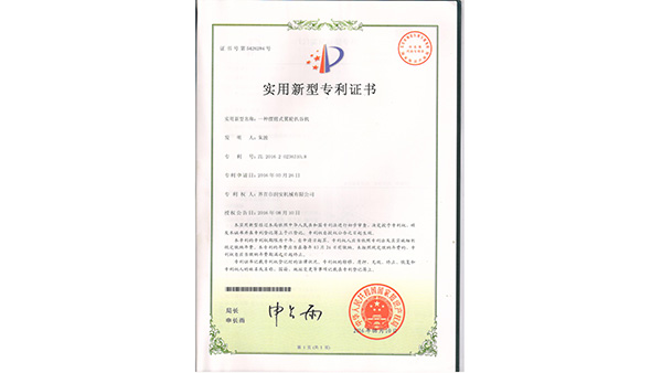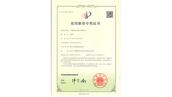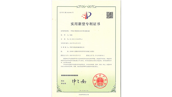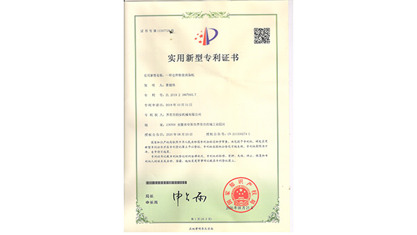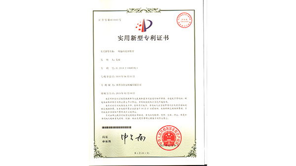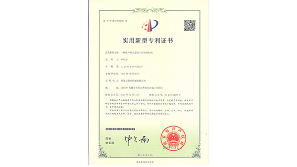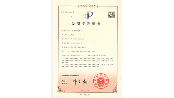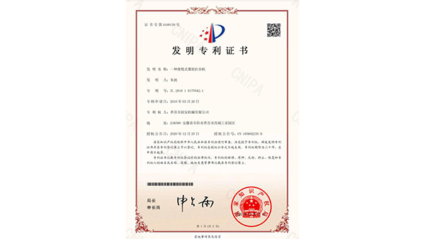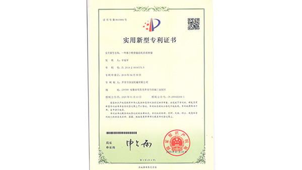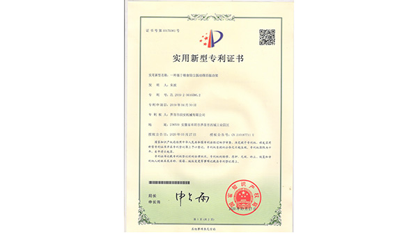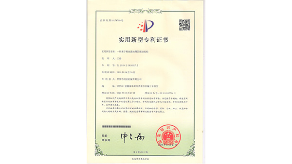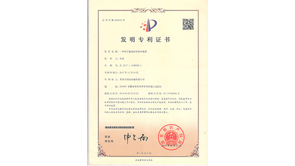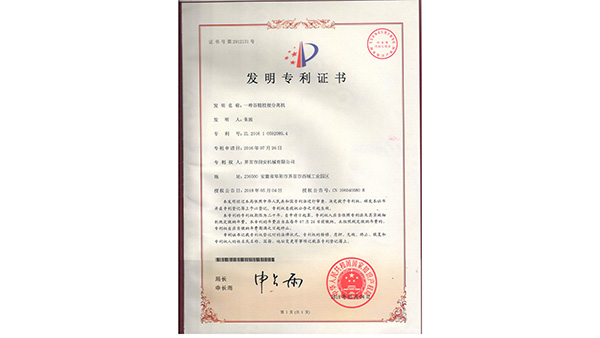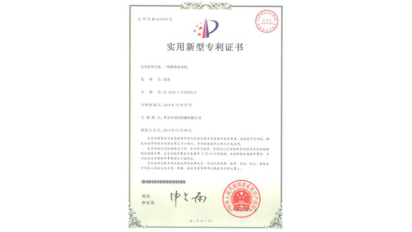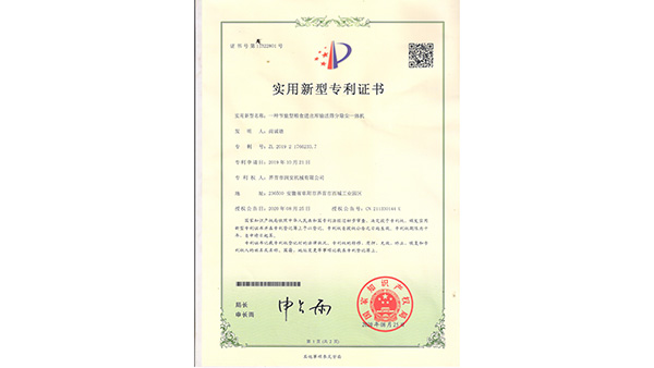 專利證書公司已通過了ISO9001質(zhì)量管理認(rèn)證、ISO14001環(huán)境管理體系認(rèn)證和ISO45001職業(yè)健康安全管理體系認(rèn)證。為中國儲備糧管理總公司糧機(jī)設(shè)備的A級供應(yīng)商、安徽省高新技術(shù)企業(yè)、擁有阜陽市企業(yè)技術(shù)中心。